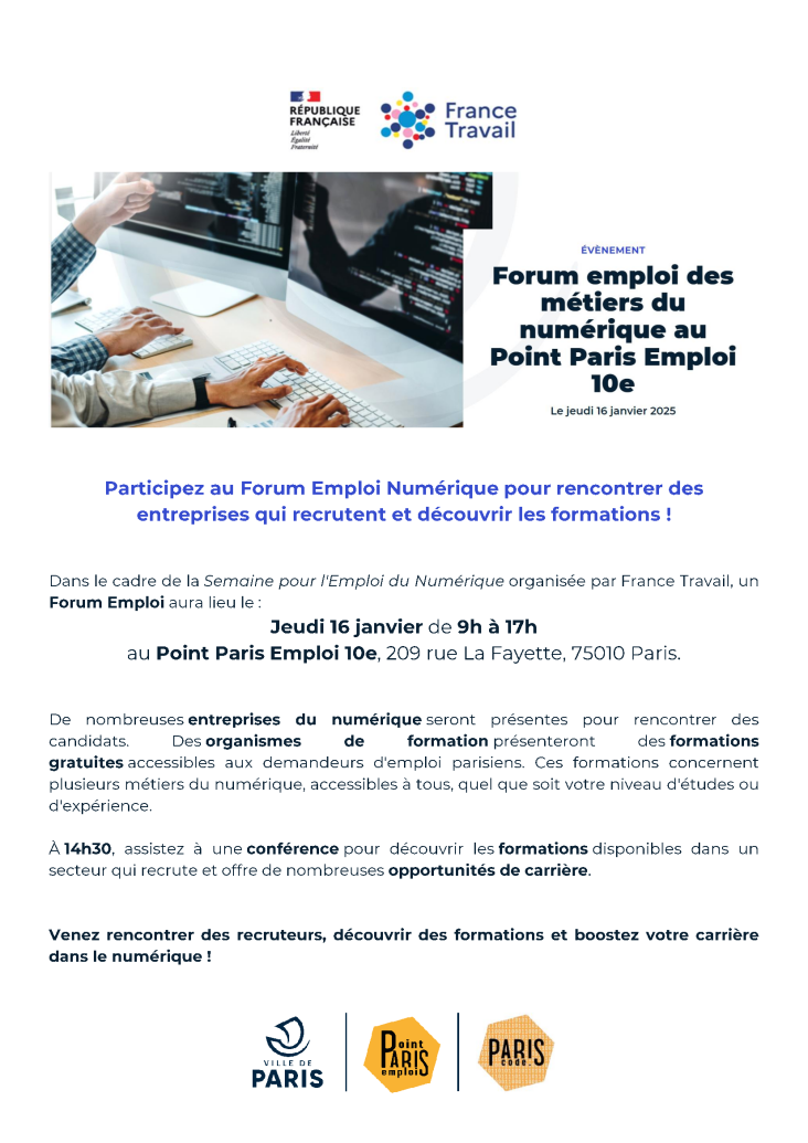 Forum Emploi des métiers du numérique 16 janvier 2025 • 09:00 → 17:00 Point Paris Emploi - 209, rue La Fayette - 75010 Paris Document téléchargeable ForumEmploiMétiersNumériqueFT_16.01.25_PPE10e.pdf 279.36 Ko dgl 14/01/2025